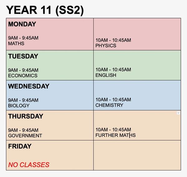 Above you can see an example schedule for the year 11 students (times in EST)! For our program, we ran two classes a day, 4 days a week, at varying levels of difficulty for students in grades 10 - 12. Though online classrooms were separated by grade level, many students challenged themselves by trying out classes at higher grade levels. Class periods typically lasted about 45 minutes.